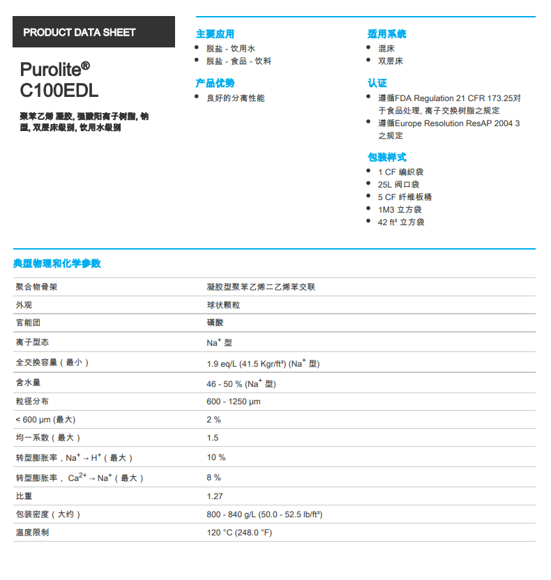 发布时间:2025-08-08 11:08:40 浏览次数:250漂莱特C100EDL软化水离子交换树脂